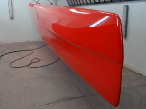 Une fois le collage effectif, l’ensemble est démoulé pour être enduit et poncé afin d’obtenir une forme parfaite. Les coques sont ensuite apprêtées en cabine de peinture avant d’accueillir leur couleur finale (rouge !).